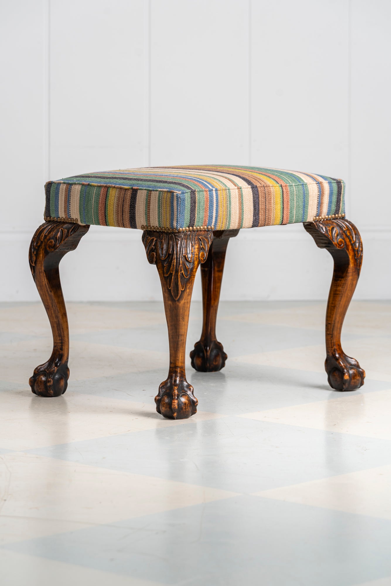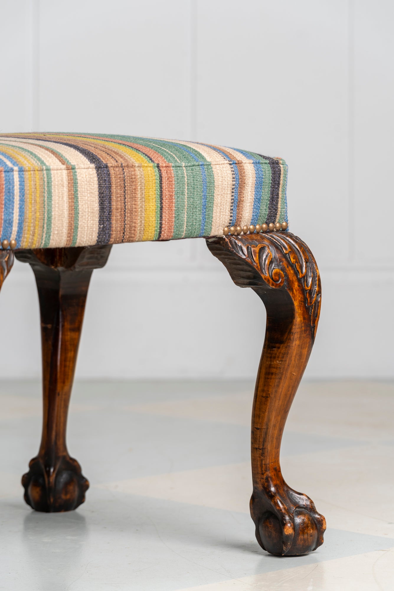 A decorative, ball and claw feet stool that has been recently upholstered in a woven striped Schumacher fabric.