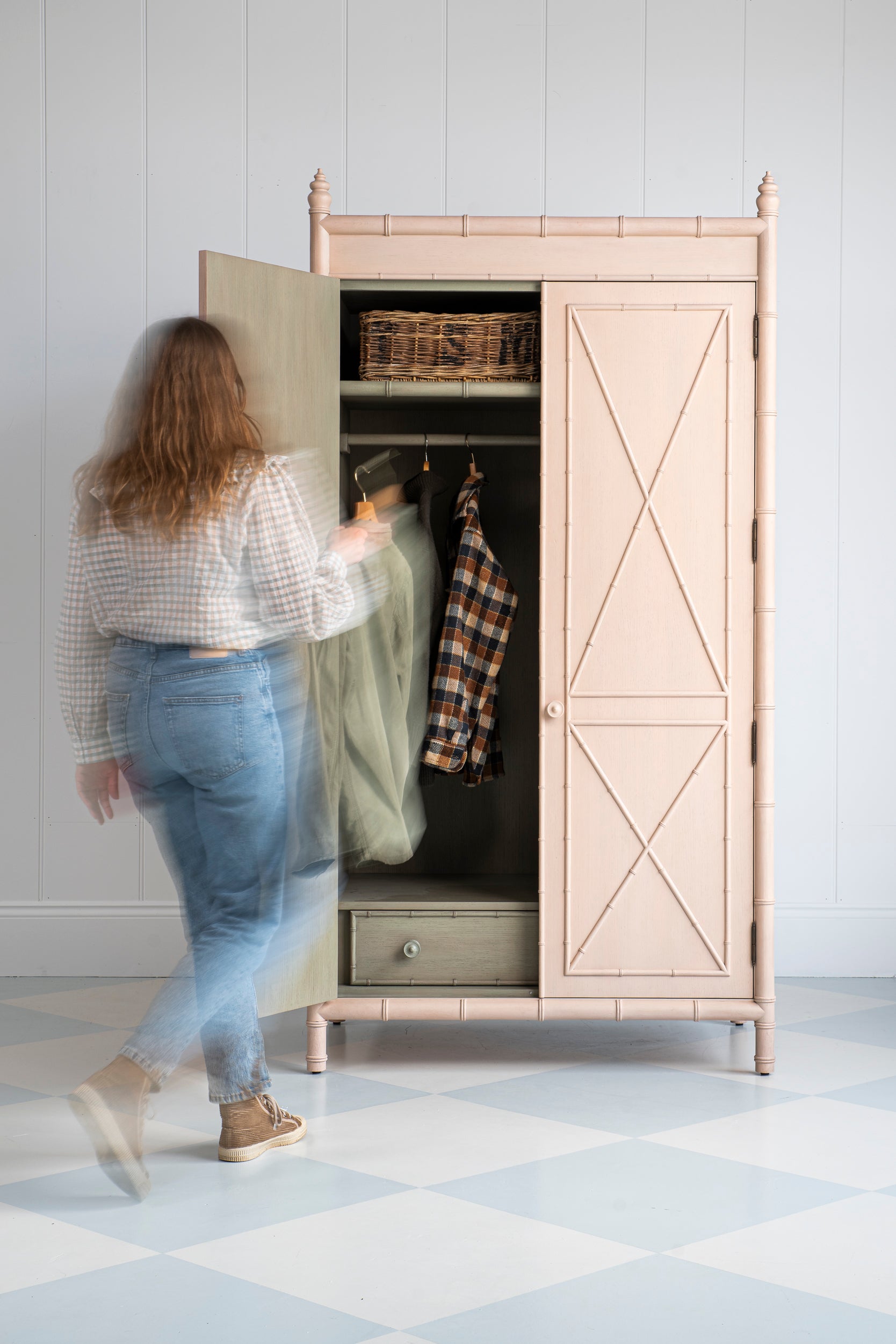 Wardrobes are hard to come by, and combined with our love of bamboo, we had to create one for our collection. One of Kate's favourite pieces, this fun furniture is ideal for guest bedrooms, children's bedrooms, or even entrance halls for hanging coats. Crafted from oak with hand-carved bamboo detailing, it's available in plaster pink, forest, stone, or primed to make your mark. Inside, it features contrast paint, a rail for hanging, and a drawer lined with charming ticking wallpaper.