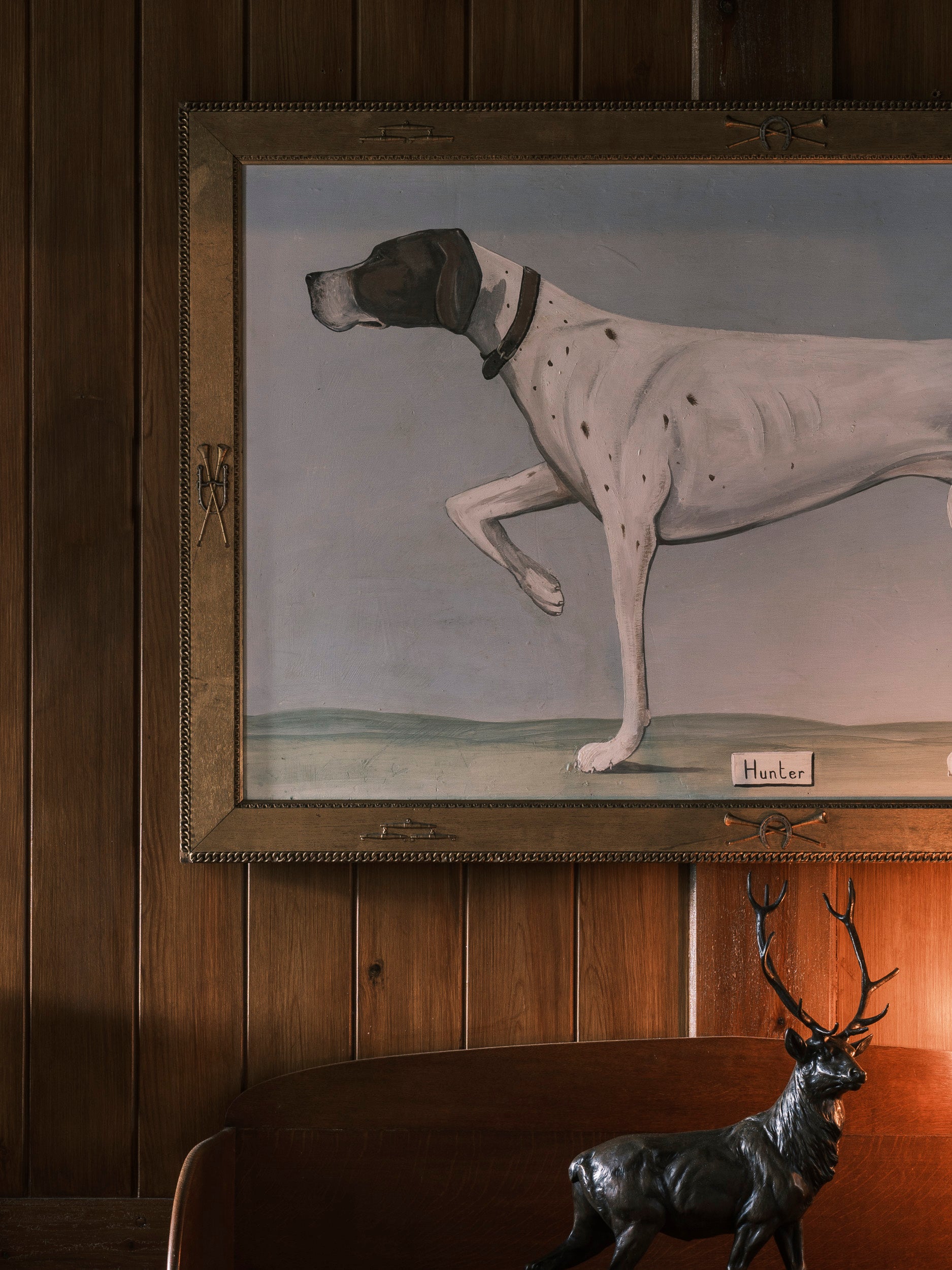 "Hunter" an amazing, large scale painting of an elegant Pointer, placed in a highly decorative gilt reclaimed frame complete with hunting motifs, a very rare frame. This piece would be great above a fireplace.
