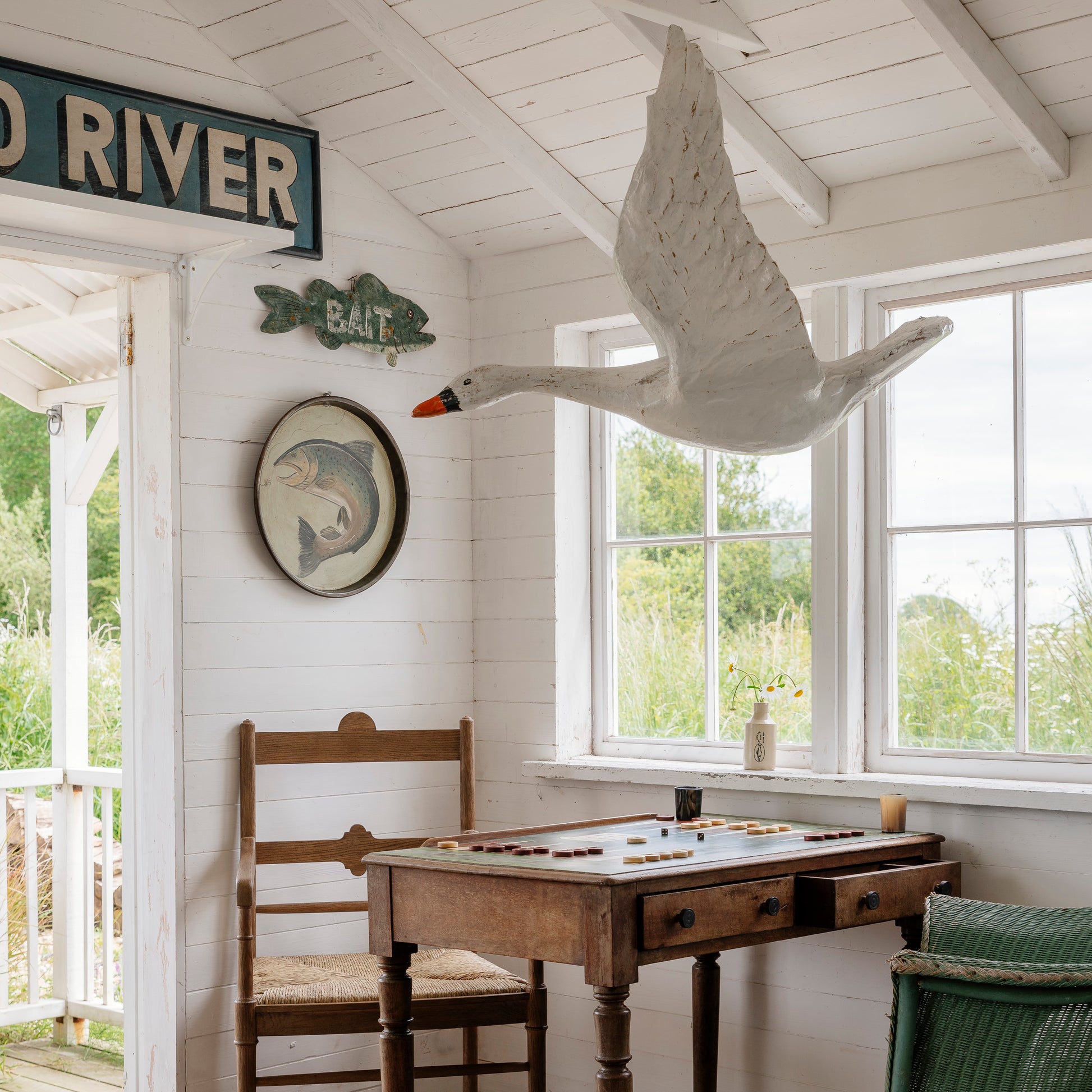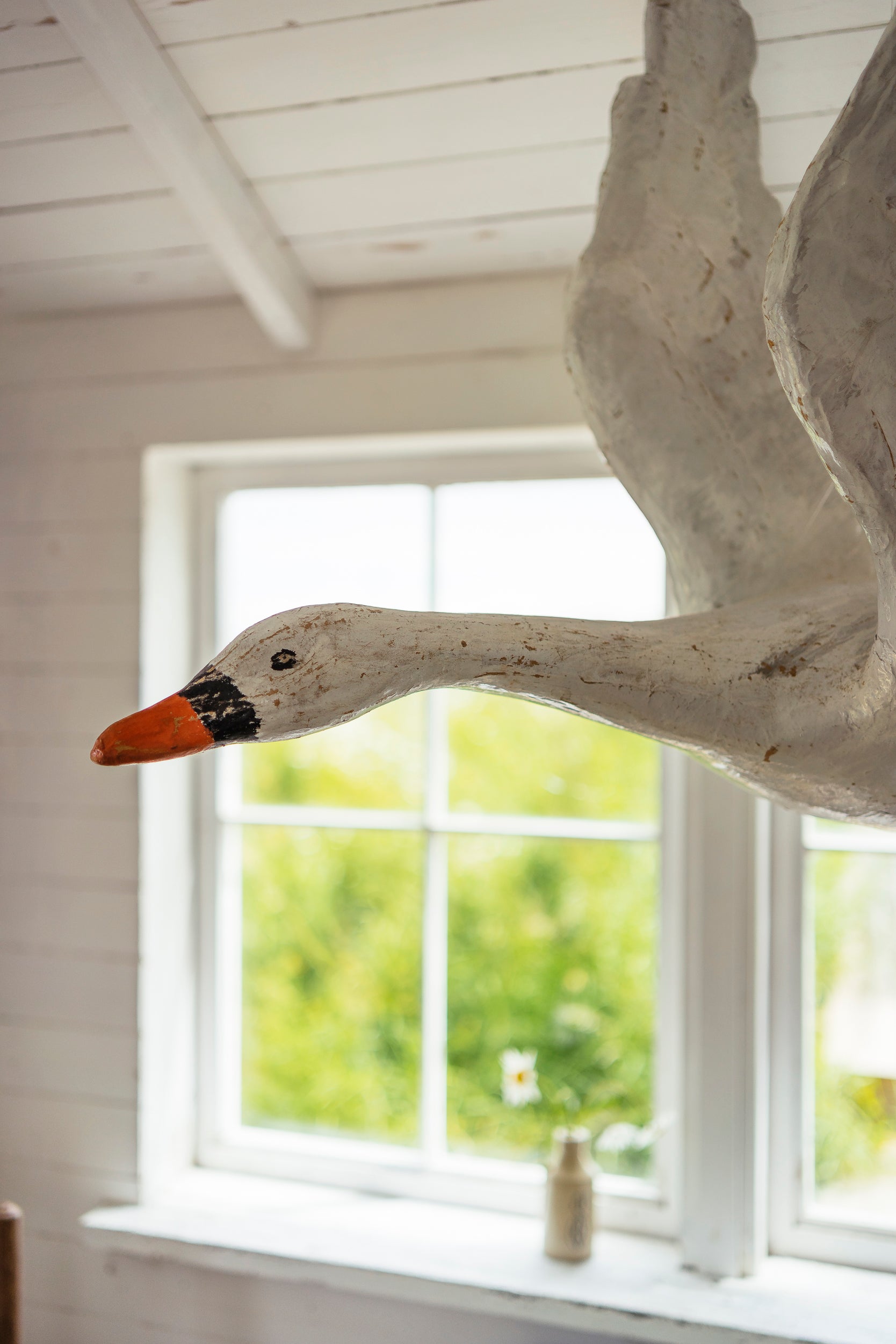 A highly decorative papier maché swan sculpture that can be hung from the ceiling.