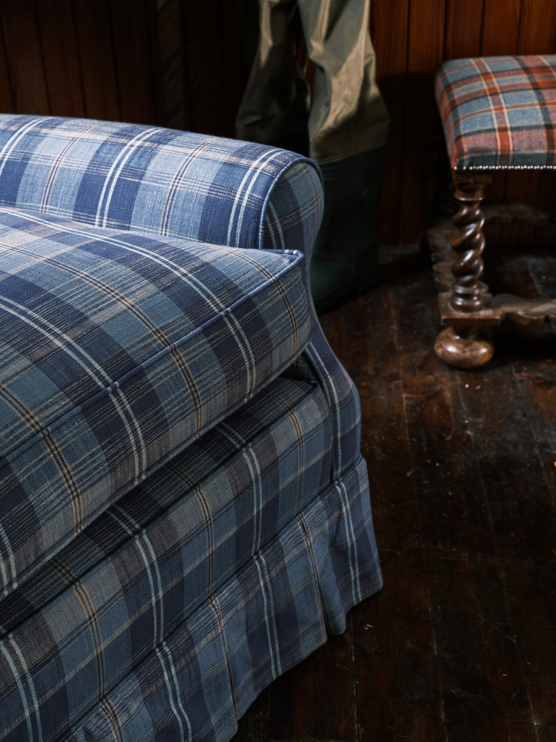 A traditionally upholstered, large proportioned armchair with a smart box pleated skirt. Upholstered in a blue Ralph Lauren Plaid fabric. Hand made and upholstered in the UK.