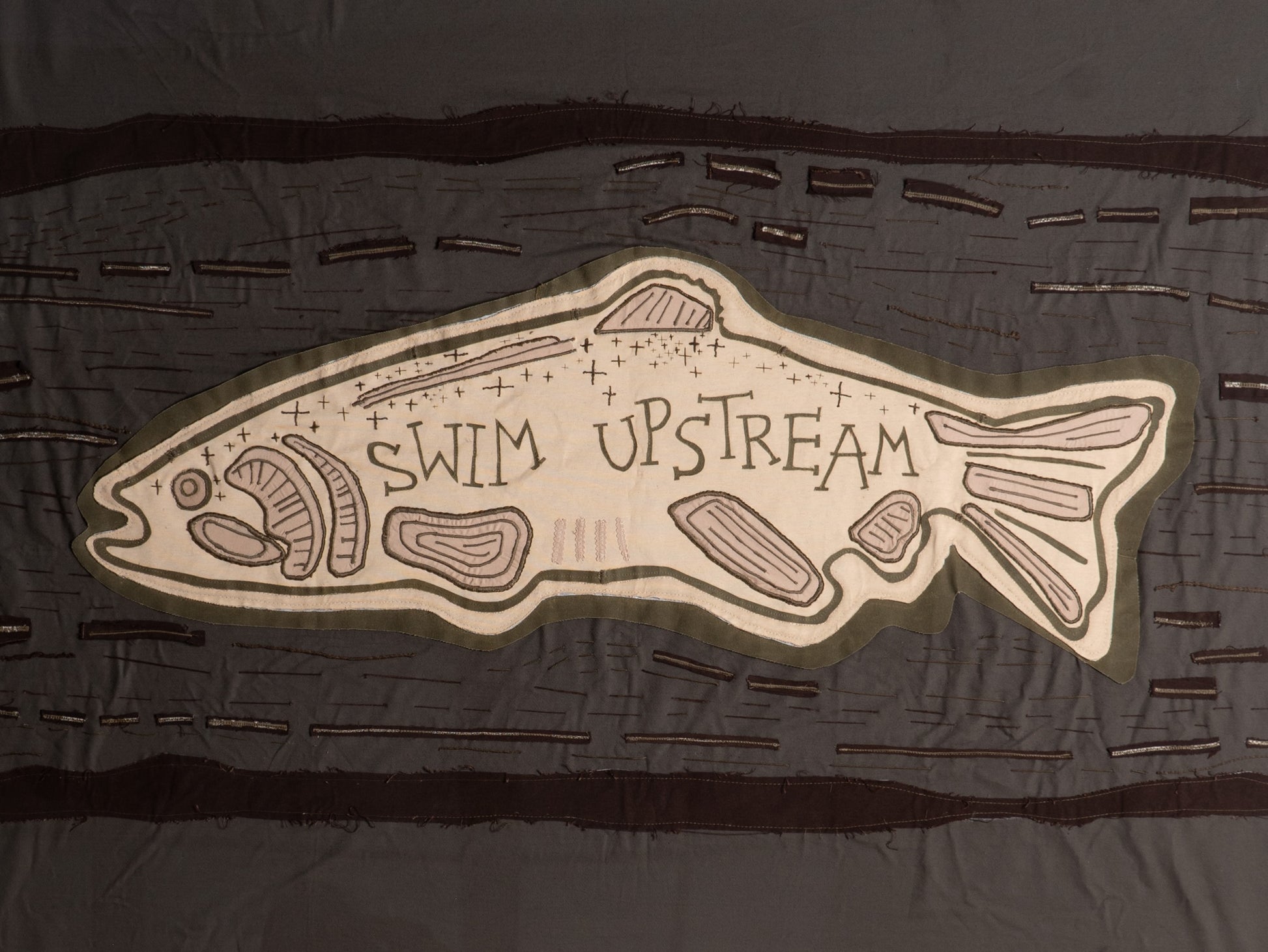Designed and handmade in England, the large-scale "Swim Upstream" Tapestry Flag is a celebration of craftsmanship. Layered, high-quality fabrics, hand-stitching, and our unique Studio HAM style make this offbeat flag a charming, one-off piece of art. The devil is in the detail, with handsewn fish gills and playful touches throughout — all finished in a bespoke dark timber rope frame.