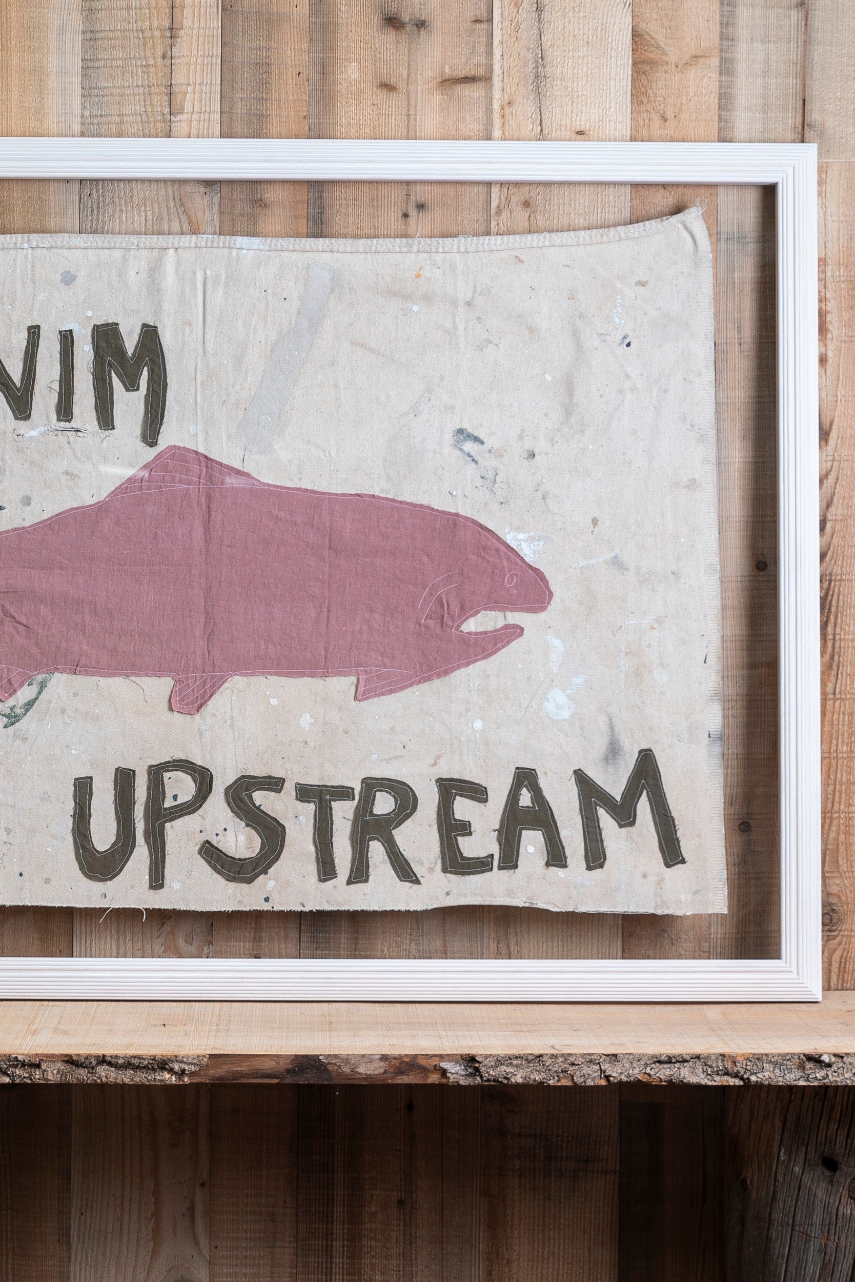"Swim Upstream" a reclaimed canvas framed flag. From Salt Air Farmhouse, a mother-son duo, Joan and Nick who are based in New York and create one of bespoke tapestries. This piece has been placed in a bespoke, reeded frame in a limed oak finish.