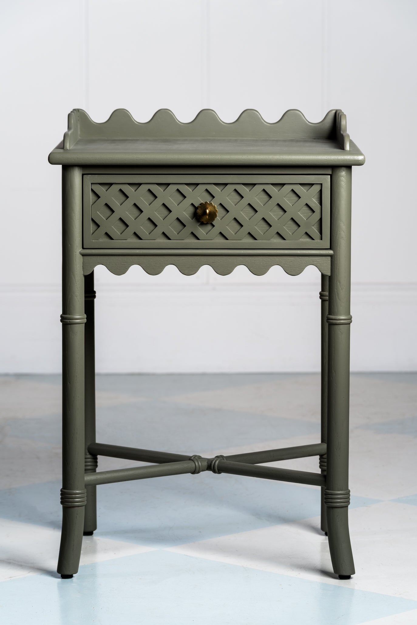 Inspired by 18th-century treillage—a longstanding reference for Tom and Kate—the Folly Bedside Table pairs lattice detailing on all sides with a decorative scalloped apron and matching raised back. A single drawer and bamboo-style turned legs complete the design.