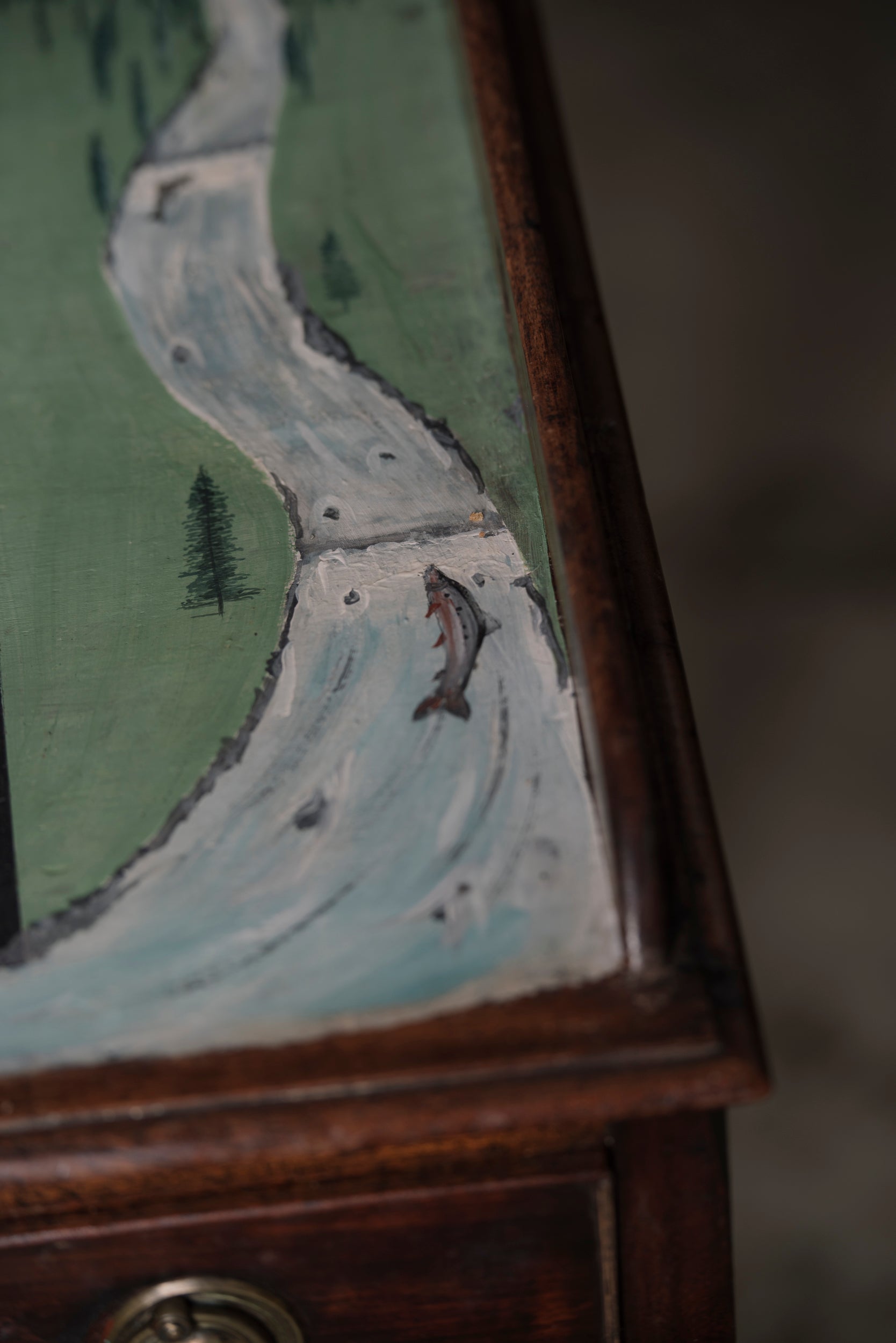 A decorative antique table, hand painted with folky, Scottish Highlands inspired decoration for our new collection. A great piece for any backgammon enthusiast.