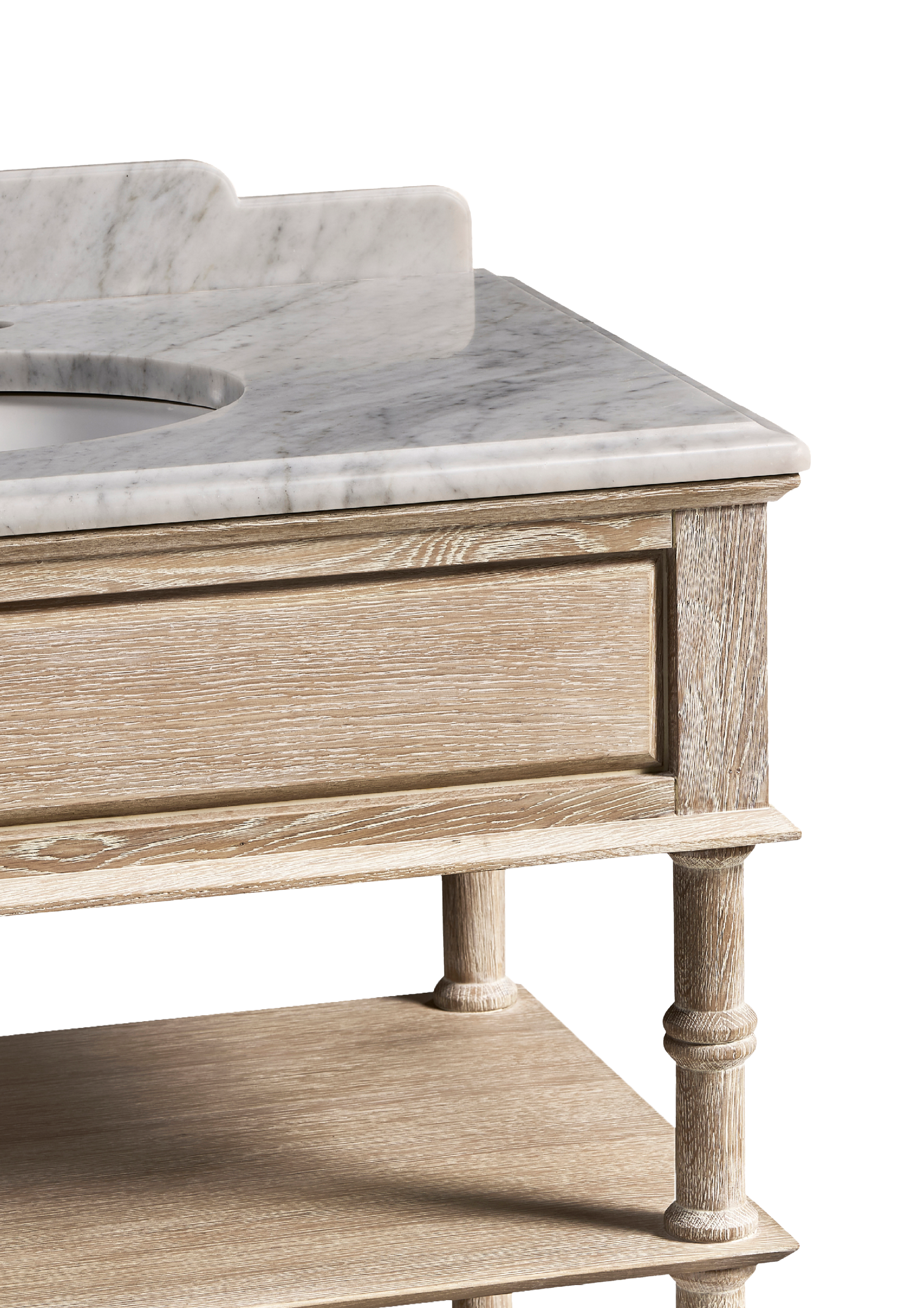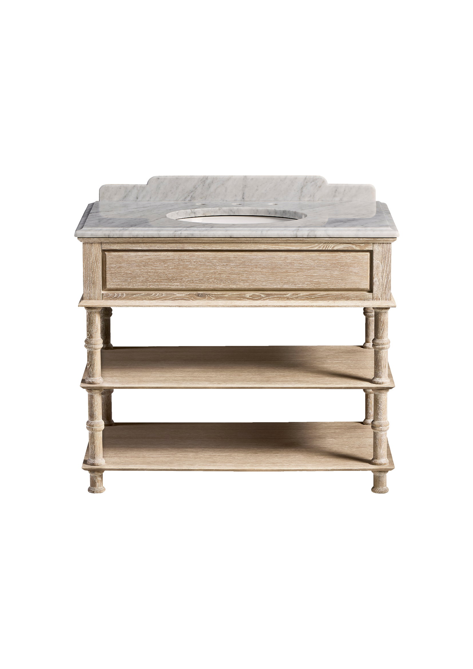 Kate and Tom have long been enthusiasts of antique spool furniture. The Spool Vanity is our take on this traditional turned spindle design, featuring a honed Carrara Marble countertop with shaped upstand, Villeroy & Boch basin and space for deck-mounted taps. It's elegant yet substantial and would complement country homes, townhouses, and rustic settings.