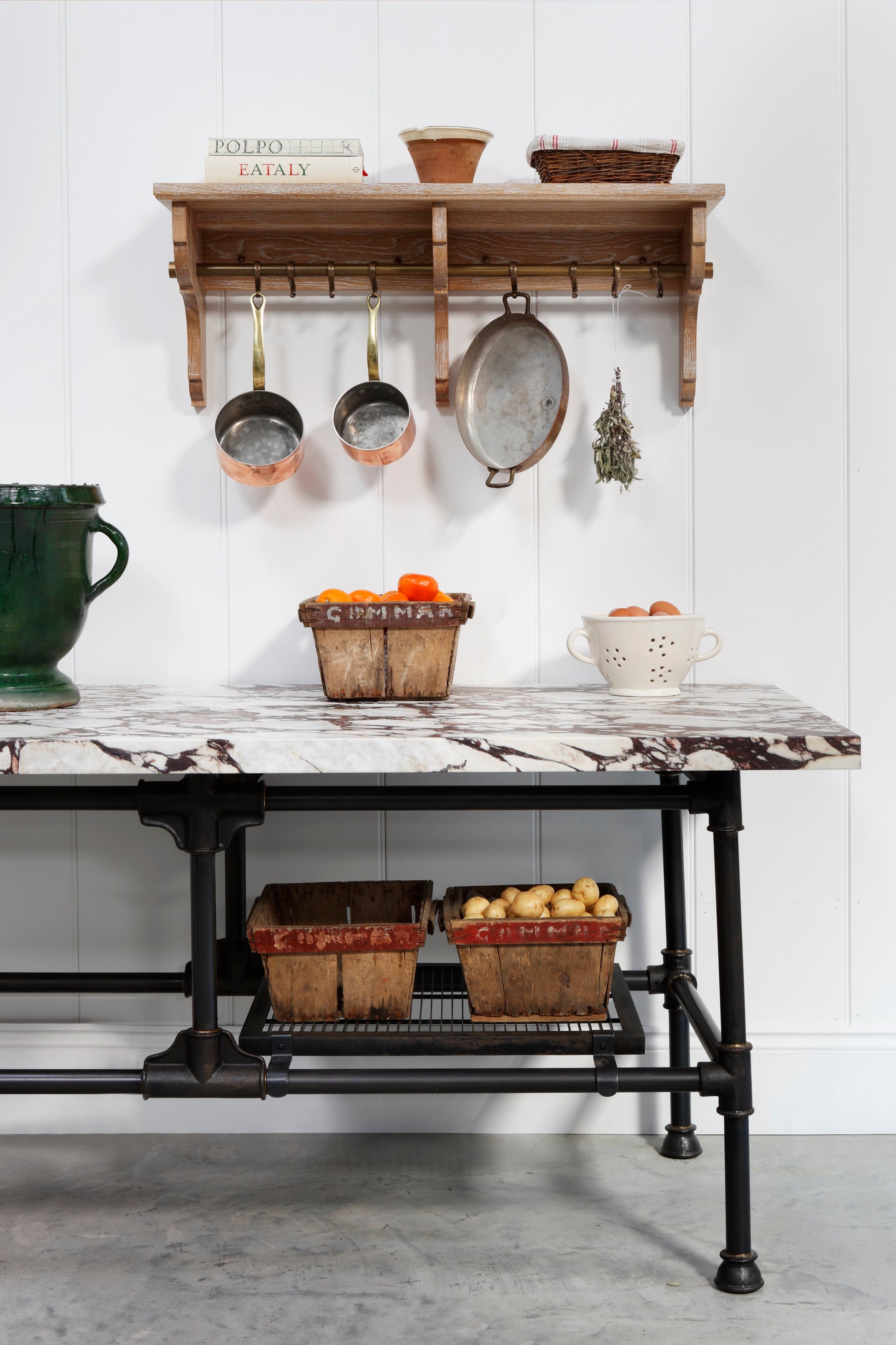 The utility Shelf is designed for kitchens and boot rooms. In kitchens you can hang pots, pans, brushes and fill the deep shelves with preservation jars or decorative items. In boot rooms it comes with fixed hooks and is perfect for dog leads, coats and hats on the shelves.